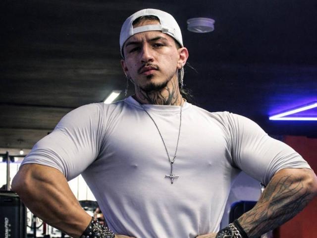 He has an athletic, well-defined physique, with muscular arms and a toned torso. He has visible tattoos on his neck (a tribal design that extends down to his chest), on his arm, and on his lower abdomen. He wears a black cap, earrings—one hoop and one pendant—a nose piercing, and a nipple piercing. He also wears a chain with a cross-shaped pendant. His expression is serious and confident, with an intense gaze and defined lips, projecting a strong and dominant image..